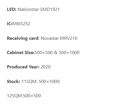 Αυτή η οθόνη LED είναι εξοπλισμένη με λαμπτήρες LED SMD1921. Οι προδιαγραφές από τον ιστότοπο κατασκευαστή Gloshine LED υποδηλώνουν ότι έχουν 4500-5000nits όταν είναι ολοκαίνουργιο. Συνιστούμε μόνο καλής ποιότητας μεταχειρισμένες οθόνες LED στους πελάτες μας και πιστεύουμε ότι η επένδυσή σας θα αποδώσει μετά από μερικές προσλήψεις, εάν είστε εταιρεία παραγωγής. Για χώρους που θέλουν να τα εγκαταστήσουν και να τα χρησιμοποιήσουν μία φορά την εβδομάδα, αναμένουμε ότι θα διαρκέσουν για τα επόμενα χρόνια.
